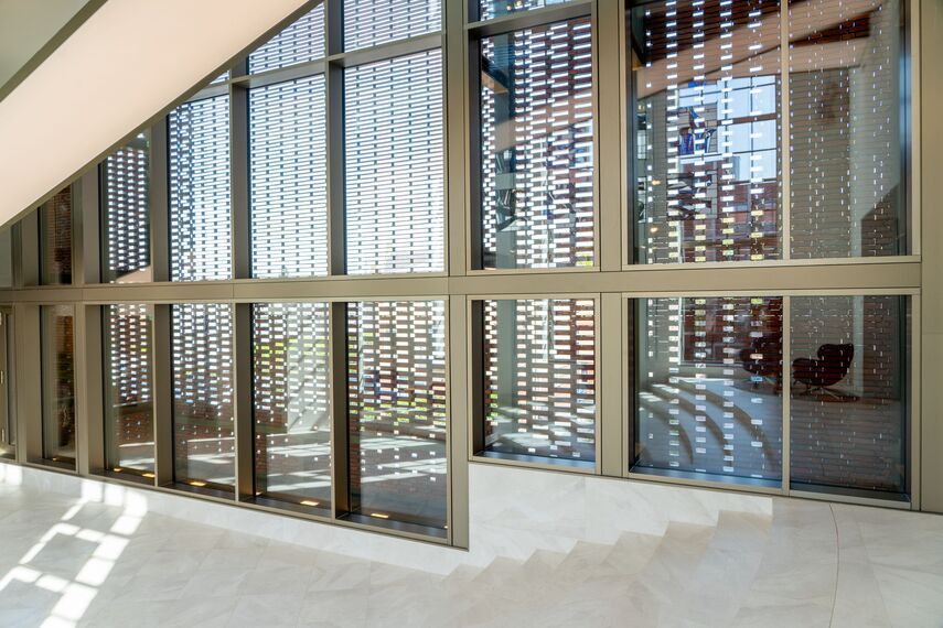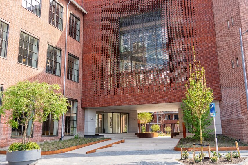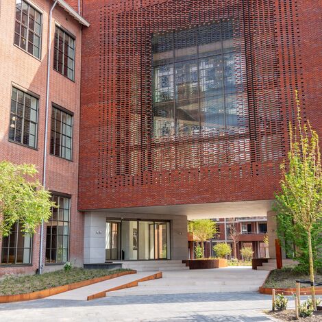 Wie voor het Middenblok staat, kan niet om de buitenzijde van het intermediair heen. Hier gaat een royale Curtain Wall 50-TT (Transom-Transom) vliesgevel van Reynaers Aluminium schuil achter een rasterwerk van baksteen dat twee gebouwen met elkaar verbindt. Dit op advies van gevelbouwer Wijmoco. Naar het midden toe worden steeds meer stenen weggelaten waardoor een speelse en transparante entree ontstaat. Het is de vondst van Bert Voss. Als vaste huisarchitect kreeg hij de opdracht om de oude KPN-centrale te renoveren tot hoofdkantoor voor L - founders of loyalty. Zijn ontwerpopdracht was ambitieus: Maak het mooiste kantoorgebouw van Nederland. “Dit voelde als een kers op de taart,” vertelt Voss. “Het gebouw zit mooi in een hoek, heeft aangename hoogtes en is dominant aanwezig. Het intermediair was echter zeer gesloten.