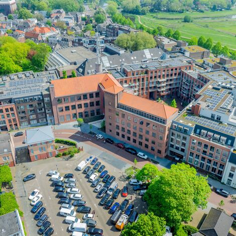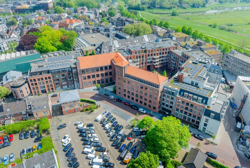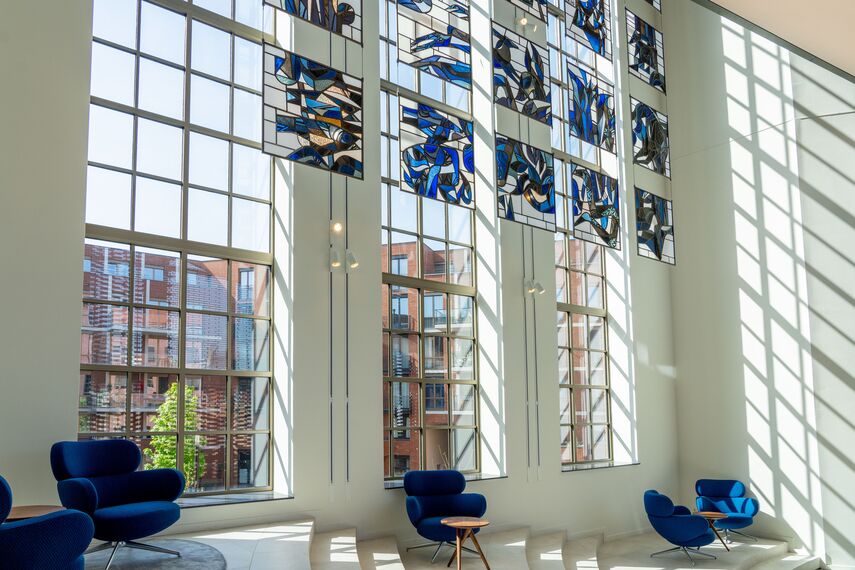 De oplossing -na sloop van het gehele intermediair- was een nieuwe een dubbele gevel boven een ruime onderdoorgang naar de nieuwe binnenplaats. De binnenkant bestaat uit een aluminium vliesgevel. Aan de buitenzijde pasten wij een kettingverband toe. De voegen vervingen we door een stalen frame met daarin bakstenen gelijmd. Naar het midden toe lieten we steeds meer stenen in een mooi ritme weg. Met als resultaat dat in het hart alle stenen nu weg zijn en er een transparante verbinding ontstaat tussen de twee gebouwen.” In totaal bestaat het gebouw uit acht verschillende verdiepingen met ieder hun eigen thema en sfeer. Variërend van een Latijns-Amerikaanse kitchenbar met flexwerkplekken tot een Californische wijnbar. Daarnaast werd het glas-in-loodkunstwerk uit de gevel van het voormalige KPN-telefoongebouw in ere hersteld. Voss hierover: “Door het kunstwerk uit de gevel te halen en in de juiste verhoudingen terug te plaatsen in het intermediair, komt het veel beter tot zijn recht. We hingen het op achter de vliesgevel. Met de juiste belichting is het een echte eyecatcher.”