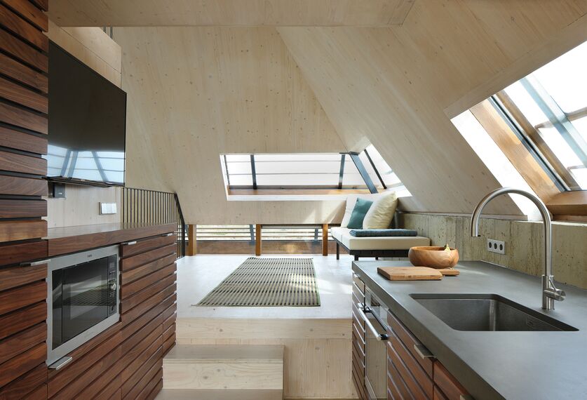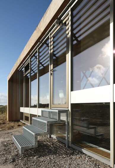 Tussen al het hout is de toepassing van aluminium in de gevel opmerkelijk te noemen. Koehler noemt het grote, schuine raam als een van de meest opvallende elementen van het project. Hiervoor is gebruik gemaakt van het aluminium vliesgevelsysteem CW 50-OW van Reynaers. Dit systeem combineert een ranke aluminium kliklijst aan de buitenzijde, met een houten binnenzijde. De kleurstelling van de gevelmaterialen is zorgvuldig afgestemd waardoor de aluminium kliklijst wegvalt in de kleur van het raam.